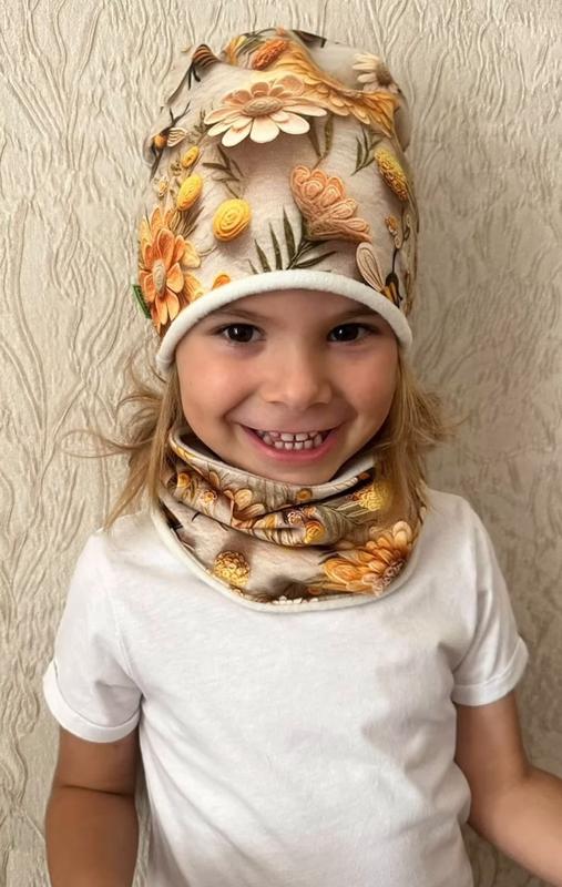 Невероятно красивый комплект в осенних цветах. Верх трикотаж двунитка, внутри тонкий стрейч-кулир. Можно внутреннюю сторону сделать из ангоровой ткани, будет теплее. Шея на любой возраст! Ткани разные! И для мальчиков также) Шапочка 220 грн Хомут 180 грн
