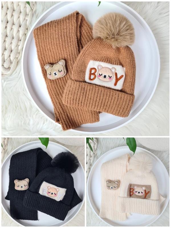 🔹Стильный комплект Boy 🔹На возраст : 1 - 6 лет 🔹Замер: шапуля - высота 18 см * ширина 19 см, шарф - длина 110 * ширина 11 см 🔹Акриловая вязка, шапка утеплена флисовым подкладом. негреба ✅В НАЯВНОСТІ - 12 шт