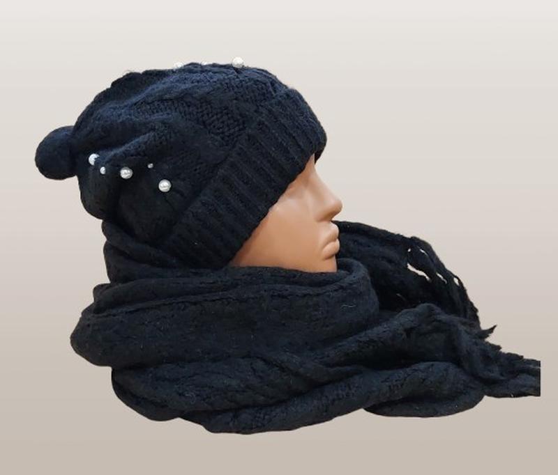 Комплект шапка и шарф от немецкого бренда C&A. Шапка декорирована перламутровыми бусинами. Ткань мягкая, хорошо тянется. (5825) Шапка: Высота: 24 см Полуобхват головы: 22 см Шарф: Длина: 230 см Ширина: 27 см Состав: 60% акрил, 40% полиамид