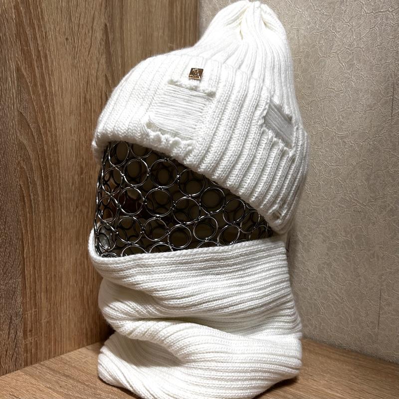 Трендовый комплект зимняя женская рваная шапка на флисе и бафф, белый