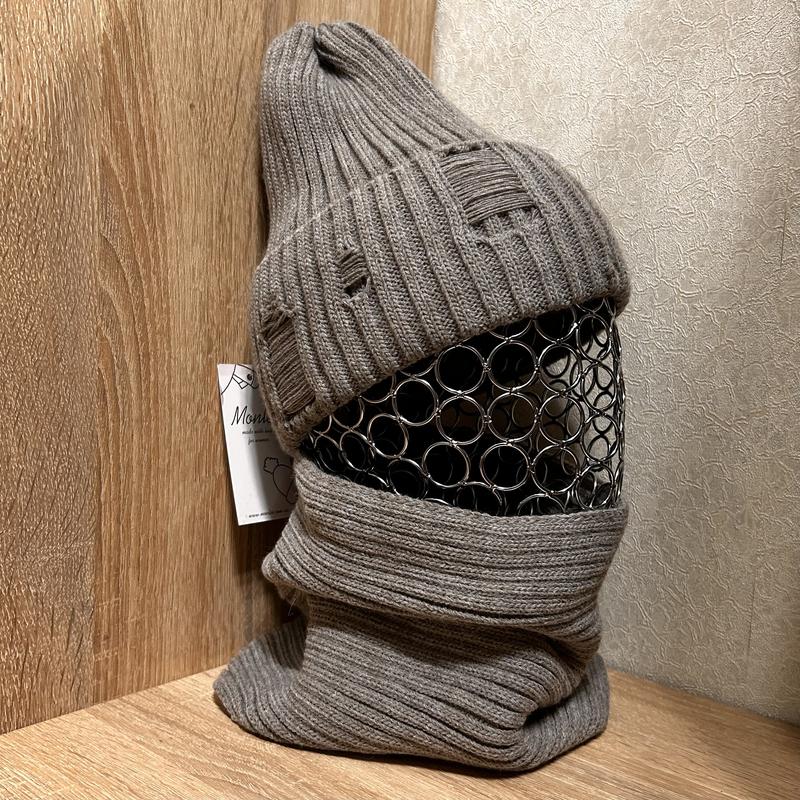 Трендовый комплект зимняя женская рваная шапка на флисе и бафф, капучино