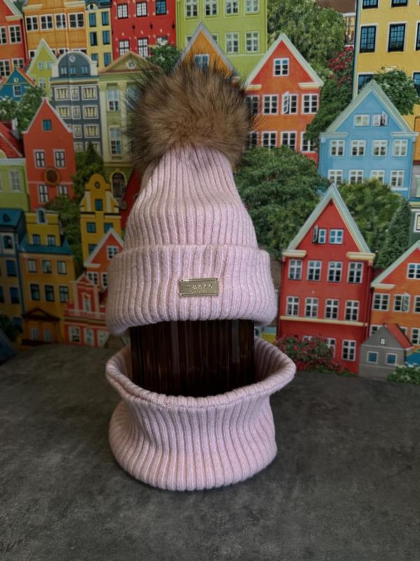 Демисезонный набор шапка и хомут , цвет пудра, машинная вязка, хорошо тянется, ложится по обьему головы, в меру теплая, красивая, бубон можно развязывать если стирку нужно сделать! Возраст 5/8 лет, замеры шапки- длина отвернутая 26 см, ширина 23. Замеры хомута-длина 22 см, высота 13.5 см.