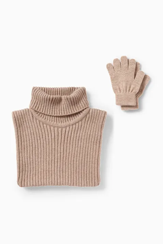 Комплект из мягкой трикотажной ткани. Топ с имитацией горловины-поло в ребристой вязке и флисовая подкладка. Перчатки с эластичным рукавом. Цвет: светло-бежевый Состав: 41% акрил/31% полиэстер/28% полиамид Рост/размер: 104-122 см (4-7Y)