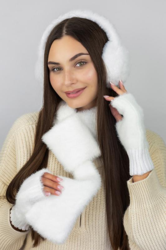 Комплект женский наушники + шарф + митенки без подкладки Сезон: Осень, Зима, Весна состав: велюр Материал: 15% котон, 40% PA, 30% PES, 5% мохер, 7% ангорет, 3% еластан Комплект женский (наушники + шарф + митенки) 7250-16- нежный и уютный сет для холодного сезона. Мягкие меховые наушники создают стильный акцент и бережно защищают от холода, шарф обволакивает теплом, а митенки добавляют комфорта и свободы движения. Лаконичный дизайн и продуманные детали делают комплект универсальным – он легко сочетается с любой верхней одеждой, создавая гармоничный и женственный образ. ✔️ Состав: пряжа с добавлением хлопка, мохера и ангорета ✔️ Цвета: белый, кремовый, светлая пудра, серый, черный ✔️ Применение: городские прогулки, поездки, фотосессии, ежедневные образы 7250-16