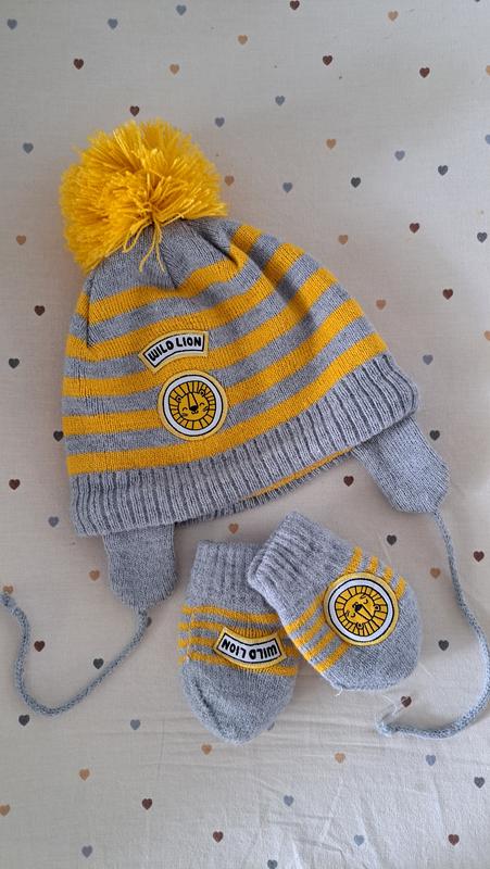 Милый и практичный набор для малыша, состоящий из вязаных шапочки с помпоном и перчаток. Цвет: серый в сочетании с желтыми полосками. Декор: нашивки с надписью “WILD LION” и изображением улыбающегося львенка. Шапочка: удобная модель с завязками, хорошо закрывает ушки, имеет яркий желтый помпон. Перчатки: без пальчиков, с манжетой для плотной фиксации, в том же стиле, что и шапка. Набор изготовлен из мягкой и теплой пряжи, приятный на ощупь, обеспечивает комфорт и защиту от холода. Подойдет для осенне зимнего сезона