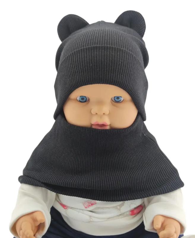 Шапка дитяча з вушками трикотажна подвійна з хомутом чорна
