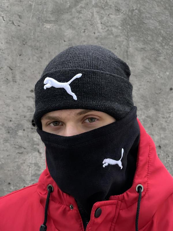 Комплект мужской: шапка с добавлением шерсти puma темно-серый меланж + баф флисовый puma ч...