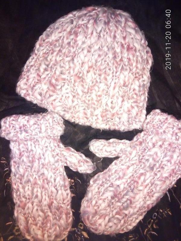 Теплая вязаная шапочка и варежки из толстой мягкой меланжевой пряжи с люрексовой ниткой. Цвет пудровая роза. Очень красивый и теплый комплект на хлопковой трикотажной подкладке. Размер универсальный XS-S-M. Смотрите все мои предложения, много аксессуаров, одежды и обуви.