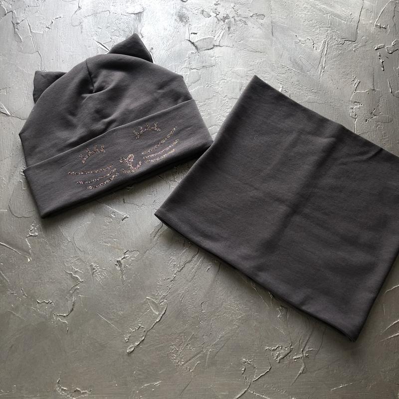 На вибір різні кольори Шапка з вушками киці і друк глітером Снуд для діток головне на вітряну погоду