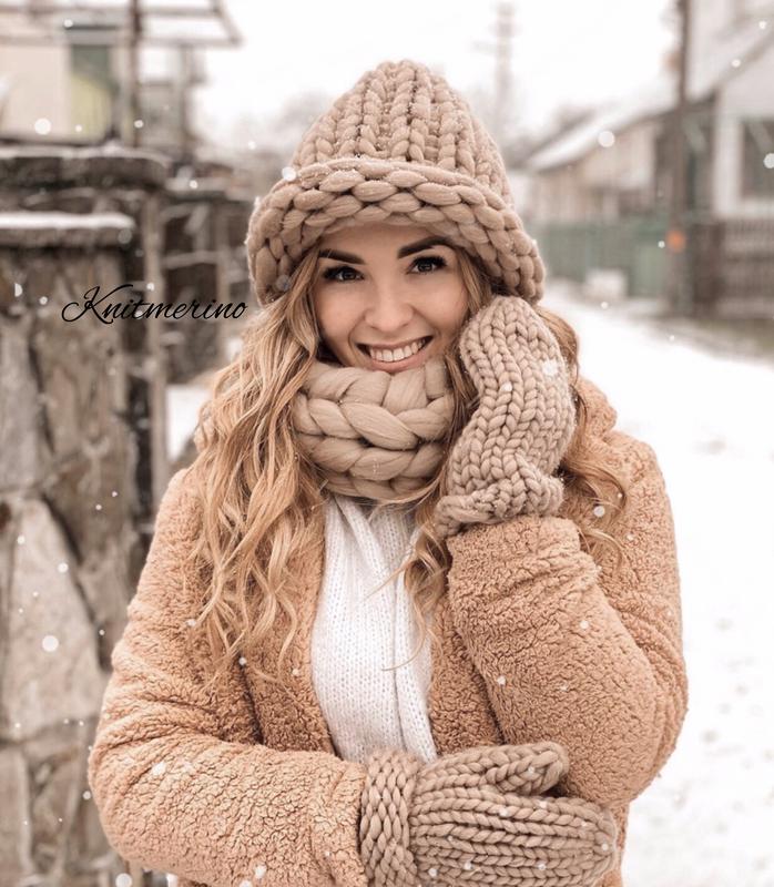 Шапка снуд варежки из 100 % шерсти мериноса. Цвет бежевый Комплект мягкий и приятный к телу, совершенно не колется Есть наложенный платёж по предоплате 100 грн. Широкая цветовая палитра, разные варианты комплектов