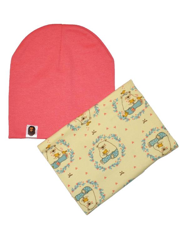 Комплект (шапка, шарф-снуд) с мишками девочкам коралловый