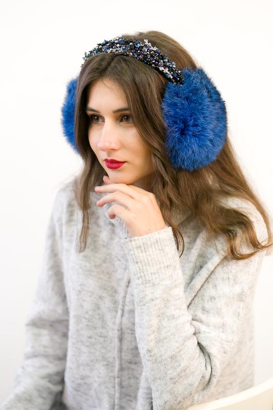Теплые меховые наушники, расшиты хрусталём, синего цвета, размер универсальный