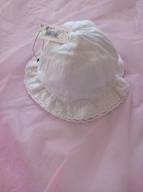 Белая очень нежная панама, без вышивки, с симпатичными листиками на ткани. на 3-9 месяцев. Очень тоненькая и нежненькая, мягенькая, приятная. Сзади аккуратная резиночка. Английское качество. объём над полями 44 см 100% хлопок.
