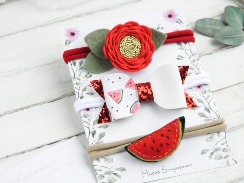 Красивый, яркий набор повязок ручной работы придется по вкусу каждой маленькой моднице. В наборе 3 повязки: с бантиком, с цветком и арбузиком. Арбузик сшит полностью вручную Это отличный вариант для подарка. По желанию можно добавить другие аксессуары и упаковать в подарочную коробку (укажите это в комментариях к заказу) ---- Детали---- ♥ Цена за 3 повязки ♥ Крепление: очень мягкая безразмерная повязка (Американская one size). Подходит на любой возраст с рождения, не сдавливает голову. Такие повязки прослужат вам очень долго ♥ Материалы: мягкий качественный фетр (пр-во Корея и Америка), эко-кожа, фоамиран ♥ Размеры декора: примерно 6 см ♥ Можно купить аксессуары по отдельности, но набором выгоднее) ---- Индивидуальный заказ ---- ♥ Можно изменить цветовую гамму изделий (свои пожелания можно написать в комментариях к заказу или написав мне сообщение) ♥ Можно сделать такие аксессуары на заколочках, стоимость будет меньше на 20 грн/шт ♥ Я делаю индивидуальные заказы. Если у вас есть вопросы или вы хотите что - то изменить в украшении, просто напишите о своем желании в комментариях к заказу или свяжитесь со мной для обсуждения деталей. Подберем именно то, что вам нужно :-) ♥ Если украшение вам нужно срочно или к конкретной дате, пожалуйста, сообщите мне об этом. Я сделаю все возможное, что бы вы получили заказ как можно быстрее ____________________________________ * Цвета могут немного отличаться из-за разных настроек и цветопередачи экранов * Смотрите больше работ в моем магазине https://mariabondarenko.********** Товар под заказ