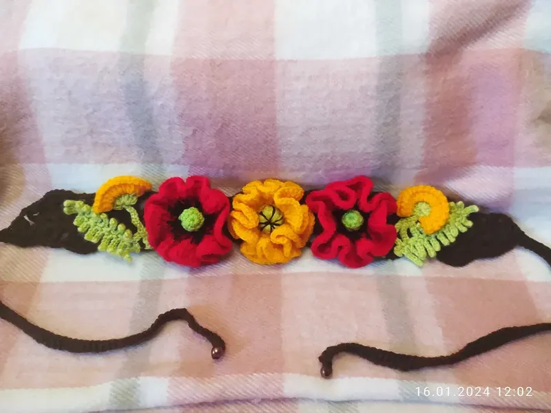 В наявності немає! В'яжу на замовлення! Прикраса зв'язана гачком з акрилових ниточок з червоними та жовтими маками. Довжина виробу без зав'язок 41 см, з ними 100 см , можна носити на голові, гарно виглядає або як пояс на вишиванку теж дуже гарно! Зв'язала для донечки вона використовує як пояс на вишиванку. 3 великі маки діаметром 8см,а по боках по маленькому маку жовтого кольору з листочком. Всі свої вироби в'яжу з любов'ю! Ціна 200 грн Будуть питання пишіть в повідомлення. Час на виконання роботи від 2х до 3х днів.