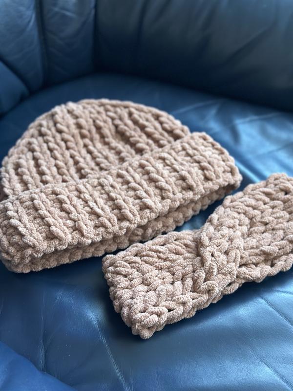 Вязана шапка повязка набір, плюшева шапка, повязка на голову