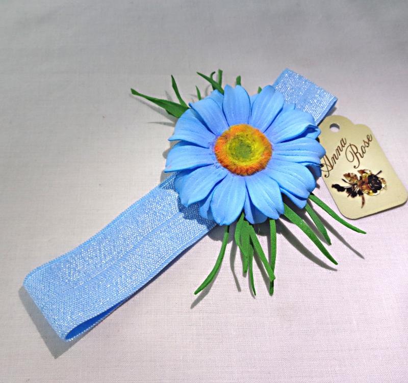 Изящное и нежное украшение - повязка для девочек - Первый аксессуар для маленькой красавицы. - Удобное и практичное украшение для девочки. - Традиционные и изысканные - для праздничных торжеств. Повязка на голову "Голубая Ромашка" - Повязка из резинки украшена легкими цветами. - Ромашки голубого цвета сделана из фоамирана вручную. - Ширина повязки 2,5 см - Диаметр цветка 5-6 см. - Объем 27-44 см. Создайте набор из нескольких украшений - белые цветы.