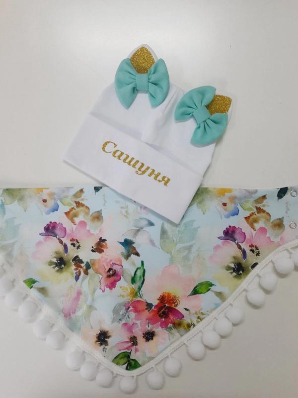 Ціна 420грн. Якщо добавити ім'я +20 грн. Стильний комплектик: шапка, хомут-косинка на кнопках. Матеріал стрейч-кулір, тканина тягнеться. Якість супер. УВАГА!!!! Виготовим під заказ будь-який колір та дизайн.