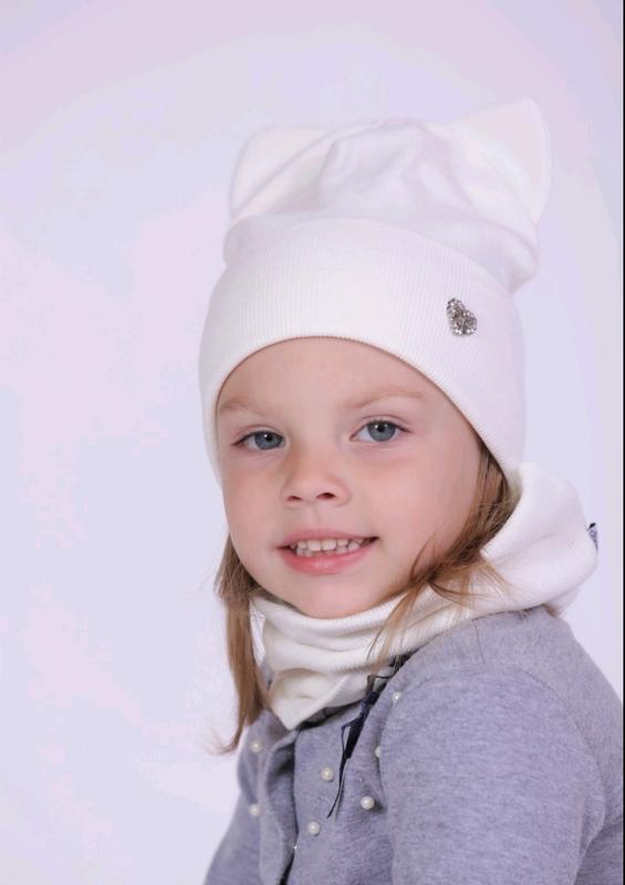 Дуже гарний набір для дівчинки білого кольору в рубчик. На шапці є вушка та маленька брошка. Шапка дуже м´яка та єластична. Підійде до морозів. Виробник Україна. Матеріал рибана, бавовна.