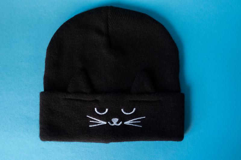 Чорна шапка з вишитою мордочкою кота і вушками. Шапка нова, не одягалась!