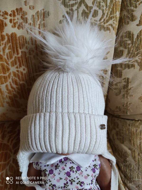 Зимова шапочка для дівчинки. Розмір 44-46. З середини фліс. Молочного кольору. Склад:50%-котон,50%-акрил.В ідеальному стані.