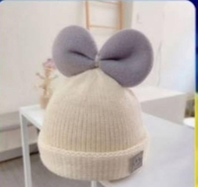 Акрилова тепленька шапочка. Якість супер. Підійде на голову окружністю 38-40 см. Висота шапочки 14 см, ширина 17 см. Колір - ніжний кремовий із сіреньким бантиком.