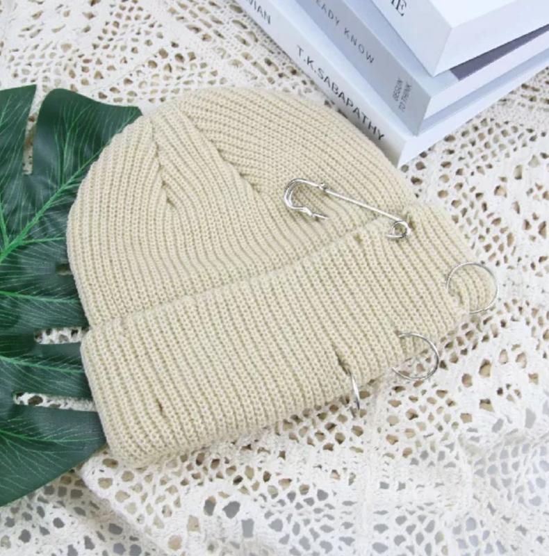 Шапка мини-бини рваная wuke с булавкой и кольцами one size бежевая