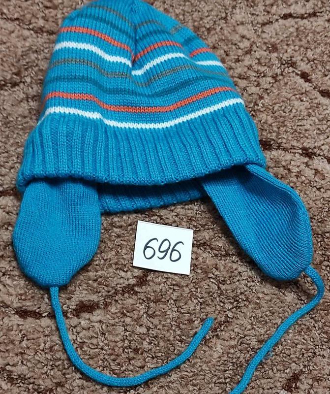 Виміри : окружність 40+8 - висота 18. Стан ідеальний, не вживана😍😍😍! Шапочка з акрилового трикотажу блакитного кольору в біло-сіро-померанчеву смужку. Підкладка із пухнастого, товстого, сірого флісу.
