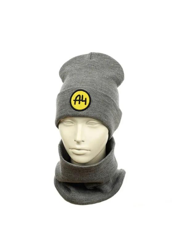 Двошаровий в'язаний комплект Шапка і Снуд для хлопчика 6 -12 років. Пов'язаний з напіввовняної пряжі. Шапка-лопата з відворотом, добре тягнеться. має видовжену форму. Відворот шапки прикрашає модна об'ємна вишивка. Розмір 54-56. шерсть - 50%, акрил - 50%