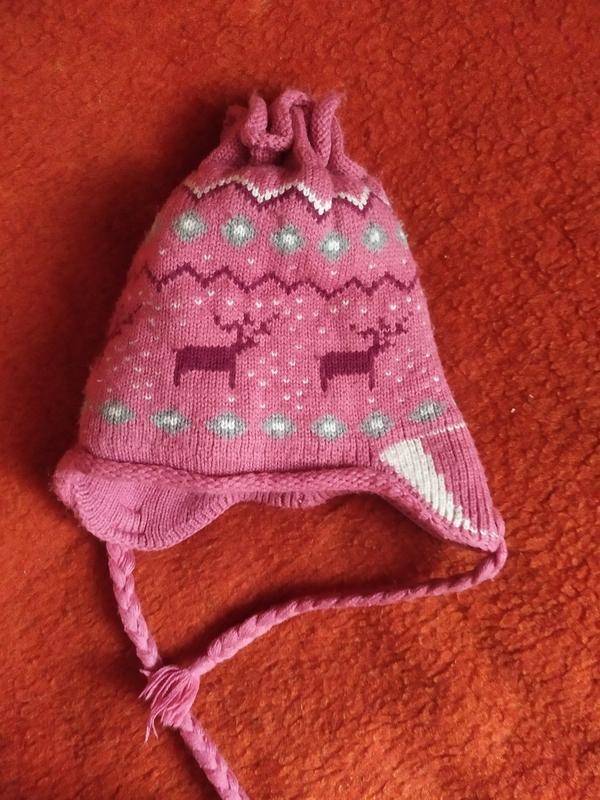 гарна і тепла шапочка,вгорі можна випустити волосся в хвостику,на вік 3-5 років