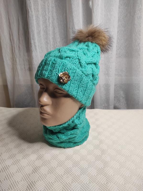 🔻 150 грн, нова Шапка з хомутом для дівчинки 3/5 років. Ручна робота. Натуральний помпон (єнот). Нова.