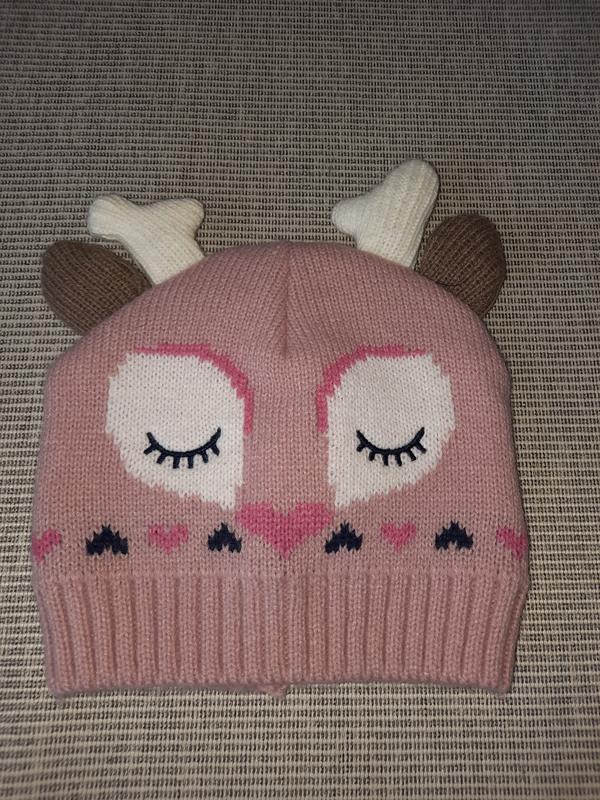 Шапочка для дівчинки, рожевого кольору, з принтом миле оленятко. Тепленька. На резиночці, гарно облягає голівку дитини. В гарному стані)