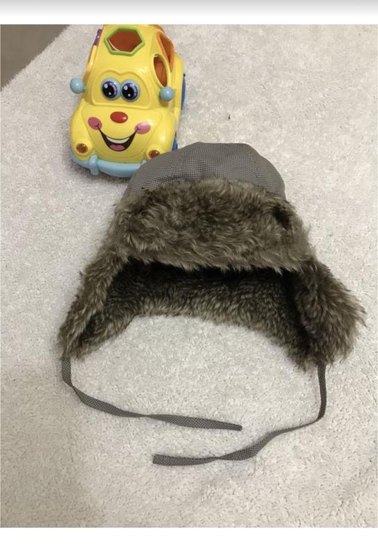 Шапка утеплена штучним хутром,має зав’язки і захист на вушка.Верх-водонепроникна тканина,всередині -фліс.По етикетці на 6-9 міс.Ідеальний стан.