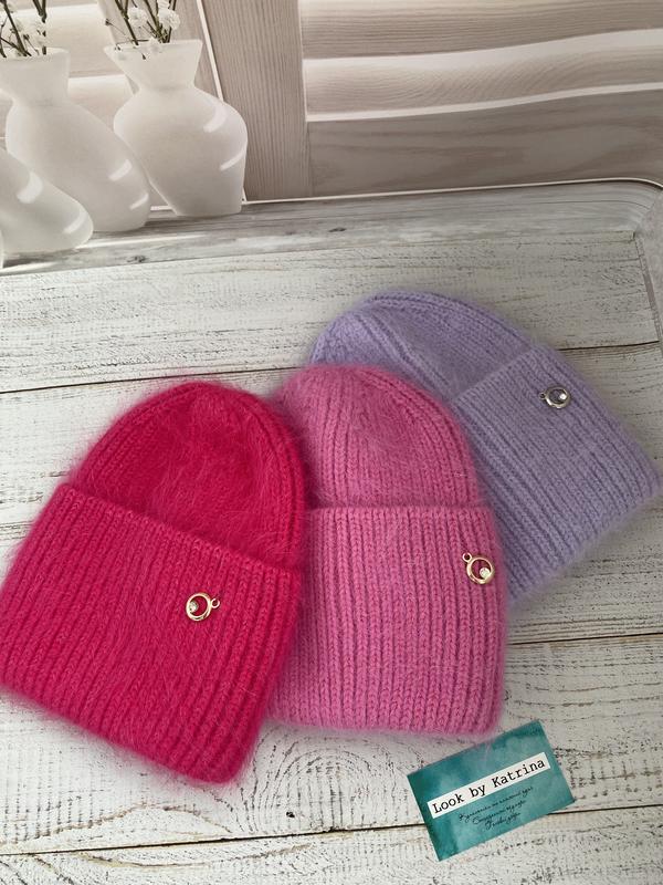 Тёплая ангоровая шапка малинового цвета розовая лиловая