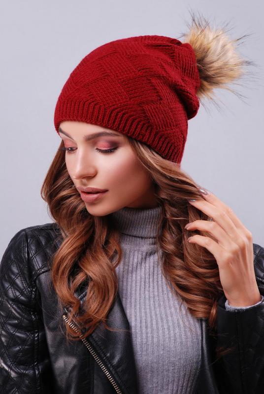 Стильна жіноча шапка, виготовлена з м'якої та приємної пряжі з пишним пампоном зі штучного хутра під "лисицю". Виріб із складними елементами в'язки. Подвійна в'язка до верхівки. Стане незамінним аксесуаром модниць, зігріваючи у прохолодну погоду. Розмір UNI Склад – 50% вовна, 50% акрил Законом «Про захист прав споживачів» не передбачено повернення та обмін даного товару належної якості! Оплата: на картку банку Відправка: Нова пошта, Укрпошта