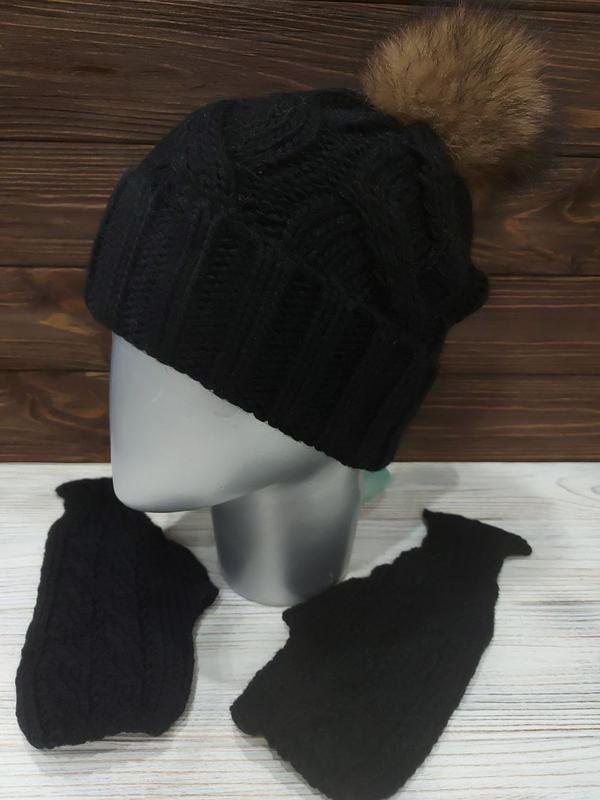Набір : жіноча шапка з бубоном ❄️, усередині утеплена на флісі 🧶+ мітенки 🧤 (рукавиці без пальчиків) Бубон натуральний. Склад: напівшерсть.