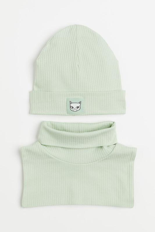Комплект из шапки и воротником-поло из мягкого хлопкового трикотажа в рубчик фирмы hm. Шапка с подворотом и аппликацией по подолу. Состав: Бавовна 95%, еластан 5% Размер: 3-7 лет 104/122 см, на объем головы 51-52см Высота шапки - 21см, ПОГ - 20см.