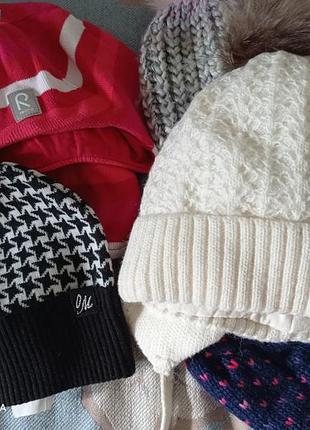 дитячі шапочки в ідеальному стані на дитину дошкільного віку. Reima 52 р. на тонкій підкладці демісезон-250грн. Reserved товста в'зка-150грн. В гусячі лапки без підкладки р 53-56.-150грн Синя в цяточки на флісі НОВА -200грн.