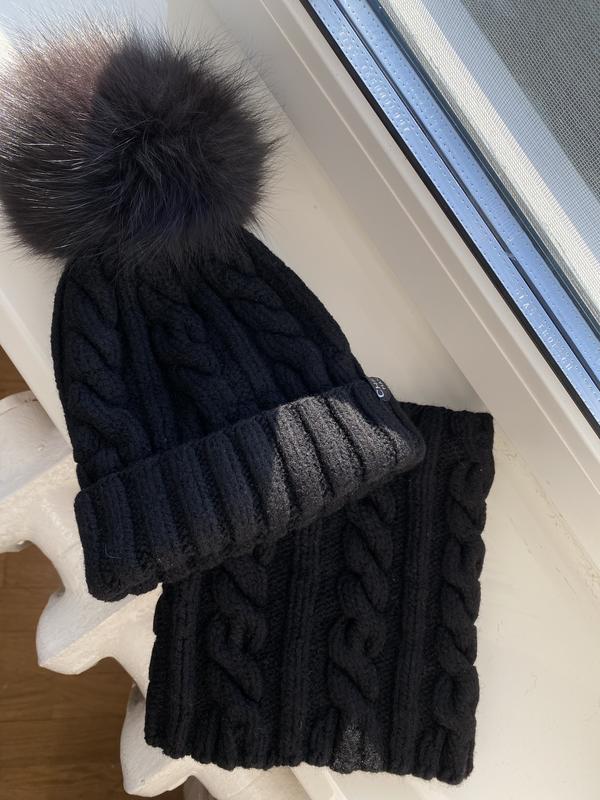 Набор вязаный по заказу. Шерсть мериноса! Очень мягкий и теплящий! Без жодного дефекту потому, что мали три набори. Носили потроху. Как новый! Ни катышек, ни зацепок. Ничего! Балабон натуральный мех! Мне набор обошелся в 1700 то то торга уже не будет. Набор в виде новенького!