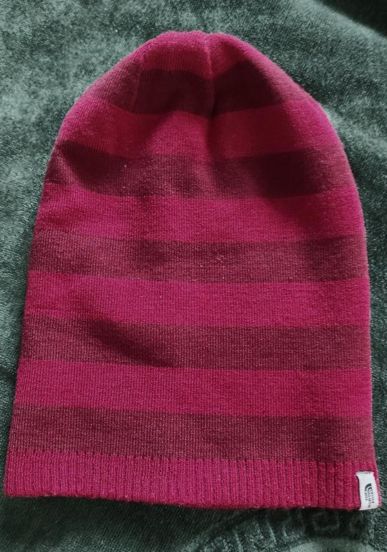 Трикотажная двойная женская фирменная шапка The north Face. (весна- осень). Цвет- полоска бордовая и темно-красная. Размер 56-58.
