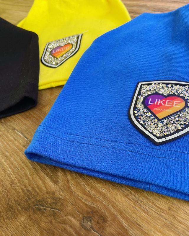 Шапочка однослойная с красивой нашивкой с камушками.Ткань стрейч.Сезон весна.Размер 3-5 р.