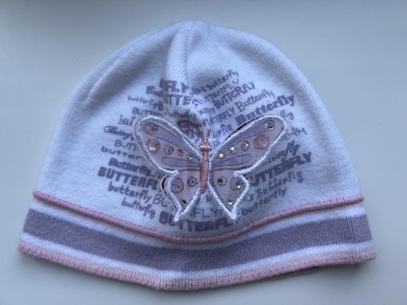 Очень милая шапочка для девочки с бабочкой, со стразами, на весну, замеры на фото