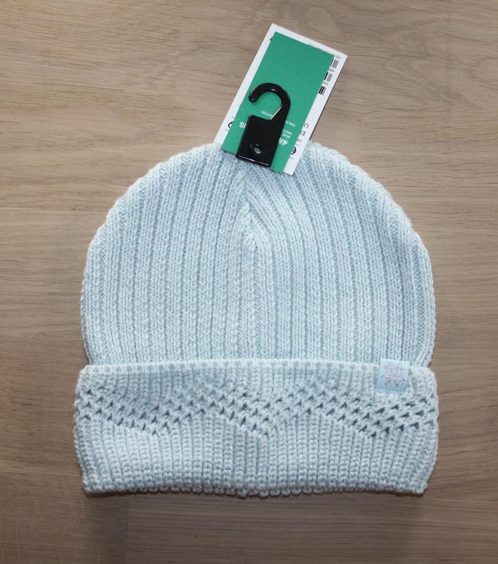 Шапка Н&М, с люрексовой нитью, ажурная структурная вязка, плотная , с отворотом, р.92/104(1,5-4 года), объём головы 50-51 см, состав: 94%хлопок, 4% полиэстер, 2% металлизированное волокно.