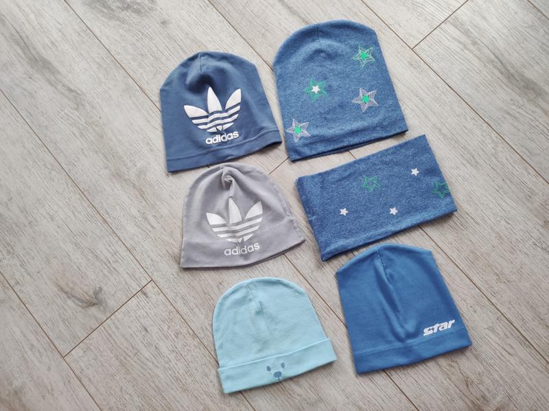 набор шапка + хомут в звездочки. На средней и более теплой весну/осень, двойной, на хомуте есть малая дирочка, мы носили так, не зашивали, так меньше видно, т.я. хомут тоже двойной и дирочка сбоку назад почти не видно. фото надам, Помимо дрышки, состояние отличное, без катышек. Носилы в 4.5 - 7 лет. Цена за набор 80 грн. . . . . Снизу на фото 1 Голова и синяя шапочки одинарные, тоненькие, на теплое весну начало лета. На 6-18 мес Синяя Новая, мы не успели ее поносить - переросли. Без недостатков Цена голубой 48 грн, новой синей 80 грн . . . . . Серая Адидас на 1,5 - 2,9 лет, на теплую весну, одинарная, без недостатков, цвет не такой яркий как был в новой, Цена 50 грн . . . . . Синяя Адидас на 3-5 лет, на теплую весну, одинарная, без недостатков, цена 60 грн за две будет дешевле + 10 % Шаффи Если доставка Укр-почтой, то +4 грн за их пакетик