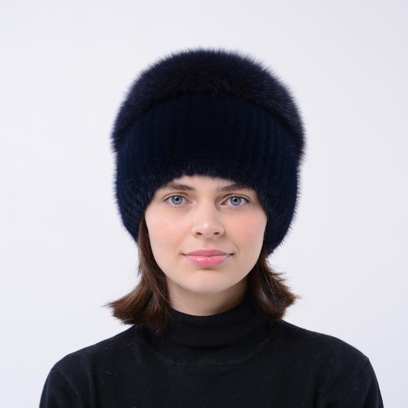 Женская норковая шапка на вязаной основе с большим бубоном из меха песца