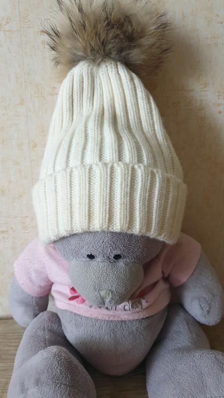 Зимова шапочка, ніжного кремового відтінку. Зверху пришитий бубон з натурального хутра або єнота або лисиці. Допомагаю продати сестрі. склад : 90% акрил, 10% хутро Дитина одягала пару раз- треба перепрати бо лежала у коробці, на згині зсередини є помарки- на фото Вік не має значення, орієнтуйтесь на заміри.