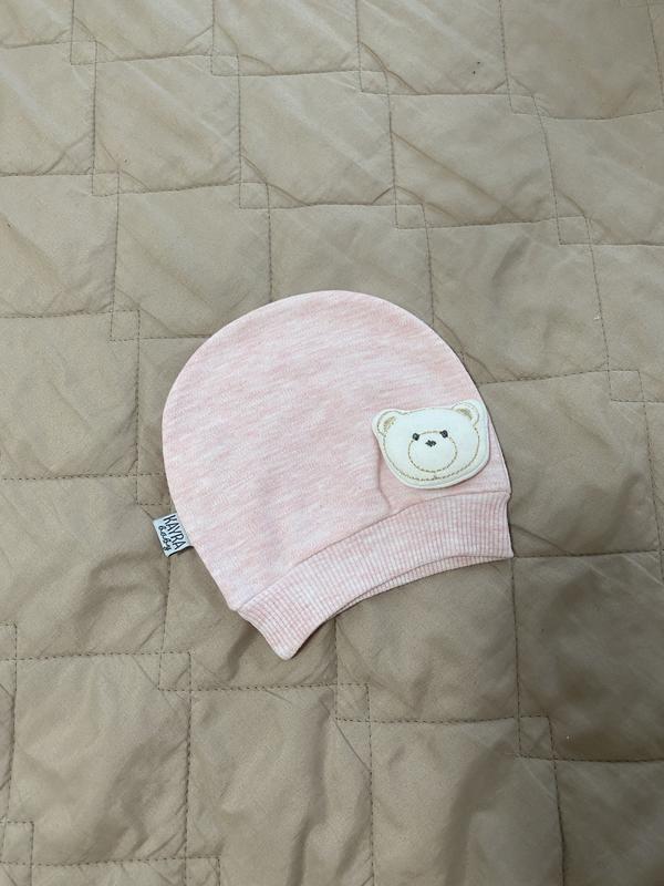 Легкая шапочка розового цвета с мишкой Ширина 15см Длина 15см