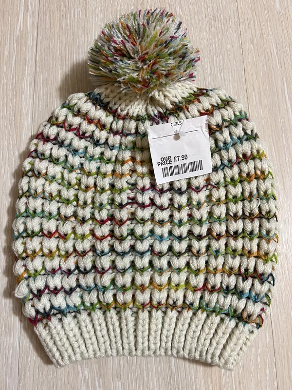 В наличии красивая разноцветная шапка. Состав: 84% акрил и 16% нейлон...нитка мягкая и приятная к телу, хорошо тянется. Длина без бубона-23 см, с бубоном-27 см, ширина-16 см...тянется до 26.