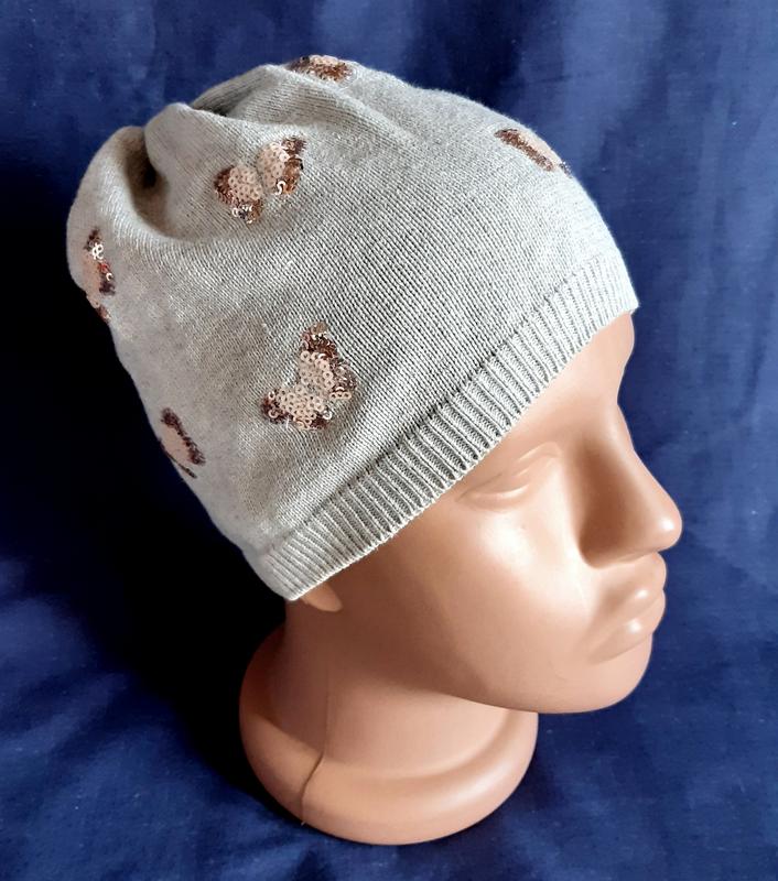 Шапочка H&M Швеция серая с бабочками из пайеток на 4-8 лет на обхват головы 51-53см ЗАМЕРЫ полуобхват 21-26см, глубина 20см 38