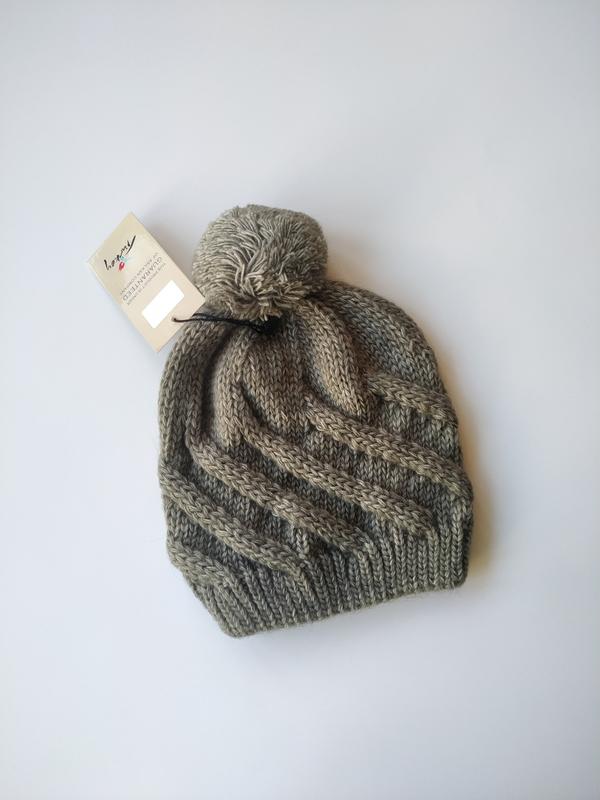Шапочка жіноча на холодну погоду з пампоном, цікавої в'язки, гарно виглядає і носиться. Колір сірий з відтінком хакі. Склад: акрил - 87%, поліамід - 13%